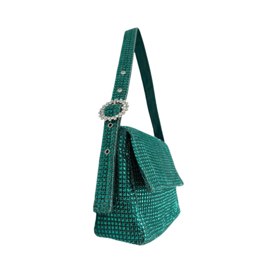 Sparkling and compact, this teal crystal mesh shoulder bag brings instant drama to simple outfits. The structured flap shape keeps it feeling considered, while the rhinestone finish catches the eye without trying too hard. Wear it with straight-leg denim and a white tee or sling it over your shoulder with a slip dress for nights out.