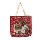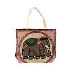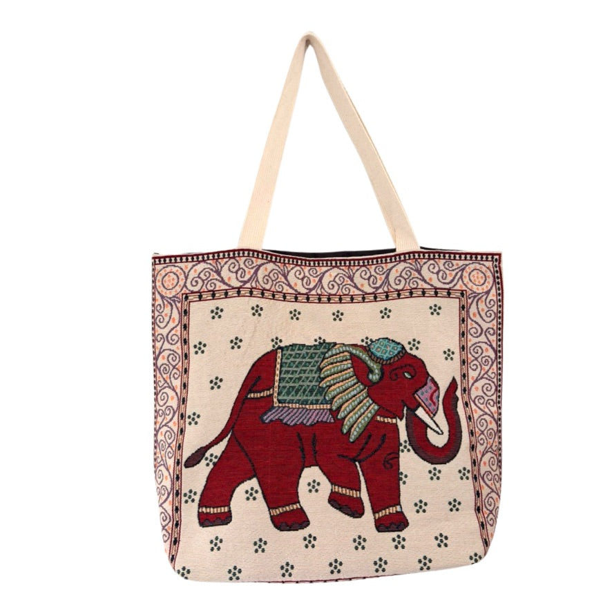 Evocative of far-flung markets and sun-dappled journeys, this embroidered tapestry tote carries both craft and character. The richly woven elephant motif — detailed in earthy tones of ochre, sage, and wine is distinctly tactile and quietly expressive while the cotton handles lend an easy, everyday sensibility.