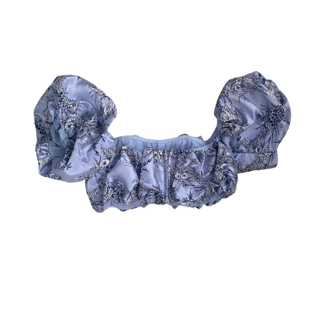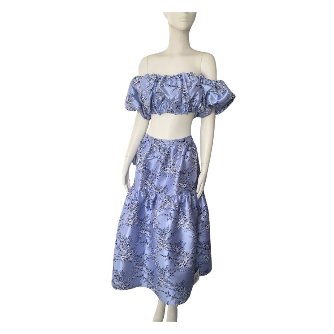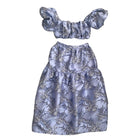 Embrace the pleasure of getting dressed-up with this blue floral co-ord set, featuring a voluminous off-the-shoulder crop top and a tiered midi skirt. The delicate floral print adds a touch of whimsy, while the structured fabric ensures a flattering fit. Ideal for garden parties or summer weddings or wherever you want to make a style statement, this set is both playful and chic. Wear together for a coordinated look, or mix and match with your wardrobe favorites for endless styling options.