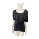 Embrace the spotlight with this midnight-hued sequined top that exudes a refined yet vibrant energy. Adorned with vertical stripes of shimmering sequins, making it an ideal choice for evening gatherings where making an impression is key. The scoop neckline provides a subtle canvas for showcasing your favourite necklace, while the short sleeves offer a touch of casual balance to the opulent sparkle. Whether paired with tailored trousers for a chic dinner ensemble, jeans or a pencil skirt for that post-work soirée, this top is your go-to for adding a dash of after-dark allure.