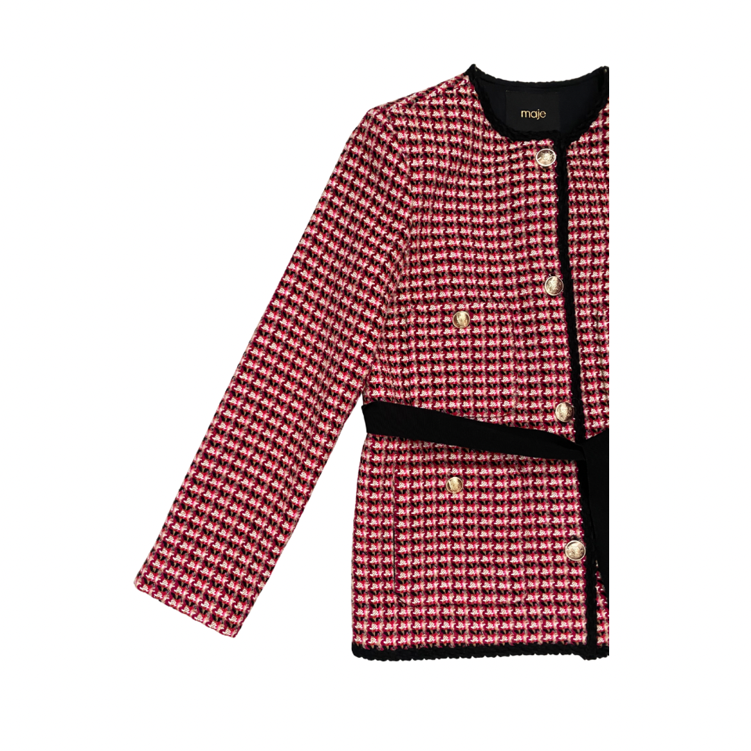 Cut in a timeless houndstooth weave, this Maje jacket channels Parisian polish with a modern edge. The round neckline and gold-toned embossed buttons nod to classic tailoring, while the detachable velvet tie belt allows for versatile styling – cinched at the waist or worn open for a relaxed silhouette. Finished with front flap pockets and subtle black trims, it’s a striking piece that balances structure with ease.