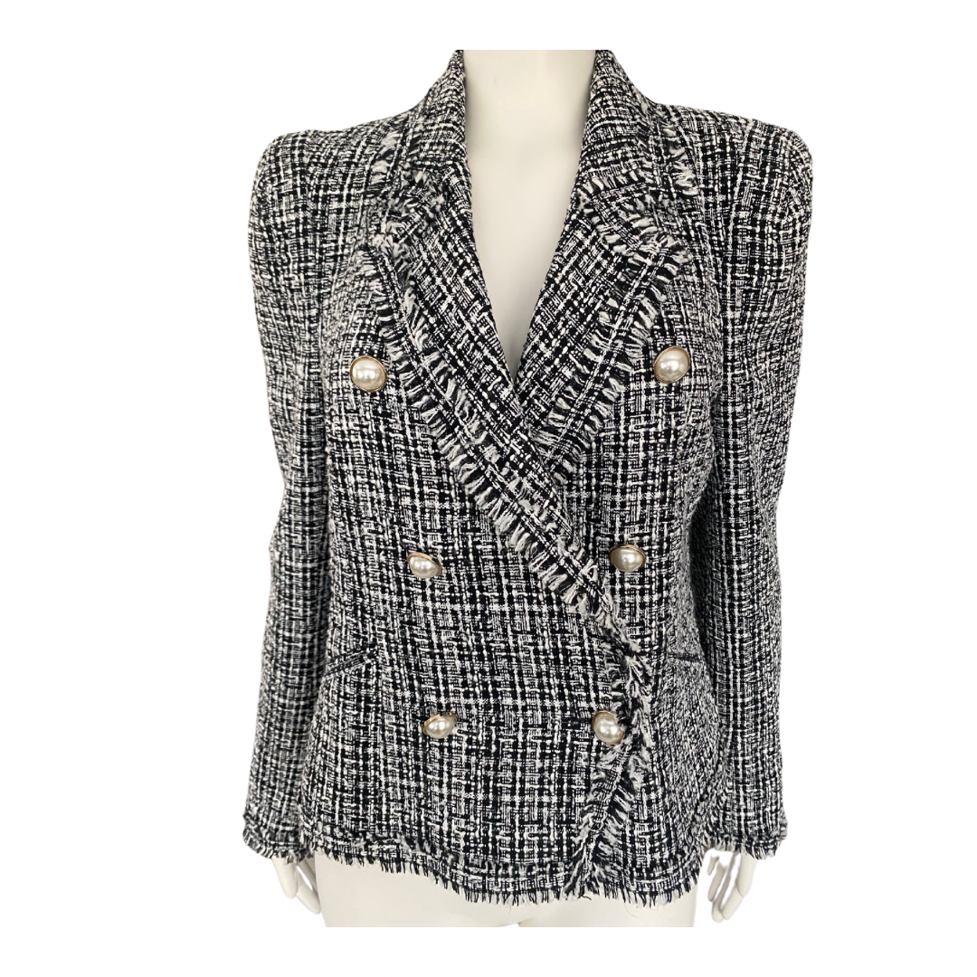 The double-breasted tweed jacket exudes confident charm. The structured silhouette, adorned with pearl buttons, adds a touch of regality, while the frayed edges provide a subtle nod to contemporary trends. The black and white woven texture delivers a timeless contrast, making it an ideal piece for both corporate days and evening dinners. Effortlessly style it with sleek trousers or tailored skirts for a bold, modern take on a classic.