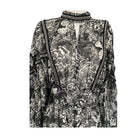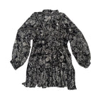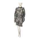 This monochrome floral mini dress brings an air of refined mystery to your wardrobe. With its high neckline and intricate floral print, it’s a piece that effortlessly balances drama and grace. The delicate ruffle hem and gathered waistline create a soft, flowing silhouette, perfect for twirling through any occasion. Whether you’re attending an afternoon garden party or an evening cocktail event, this dress ensures you leave an unforgettable impression. Pair it with ankle boots for an edgy touch or sleek heels for a more polished look.