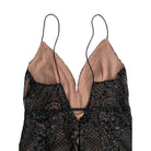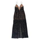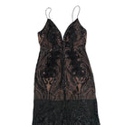 This dress captures a cinematic allure, blending timeless sophistication with contemporary glamour. The sheer nude underlay, delicately overlaid with intricate black beading and embroidery, creates a striking contrast. Its plunging neckline and slender spaghetti straps exude refined drama, while the floor-length silhouette flatters with its body-skimming fit. Perfect for black-tie events, galas, or any occasion demanding your most daringly elegant look. Pair with minimal jewelry and a bold red lip to complete the statement.