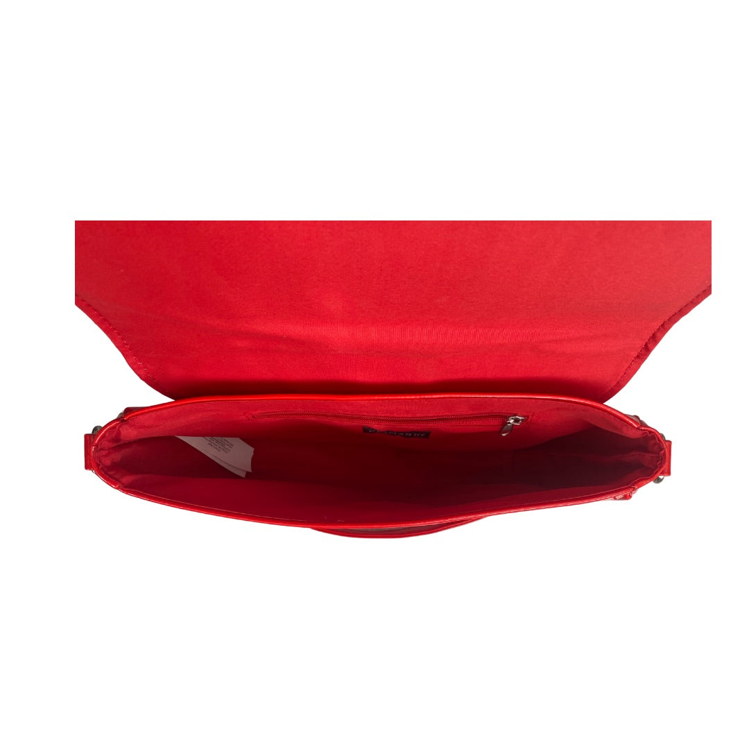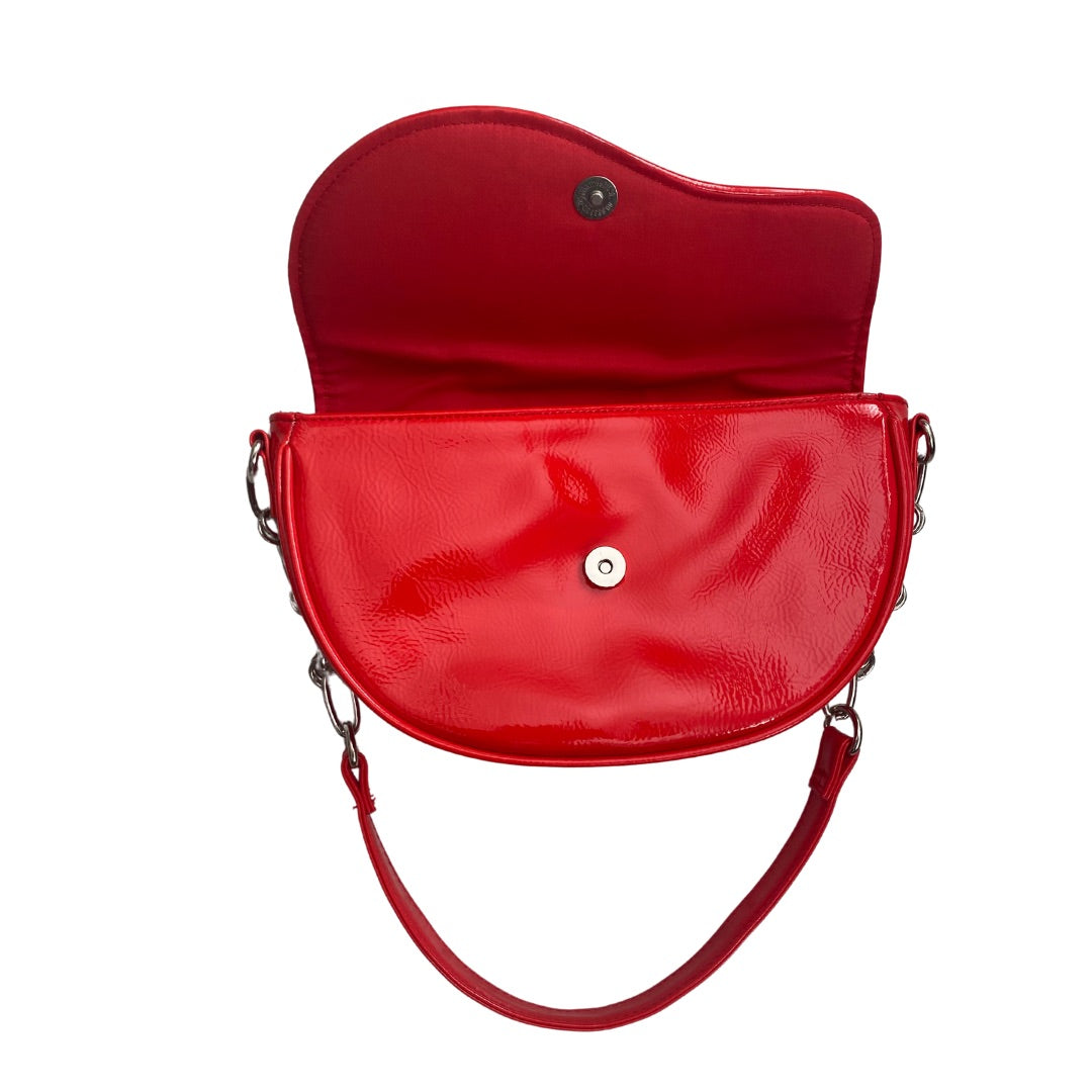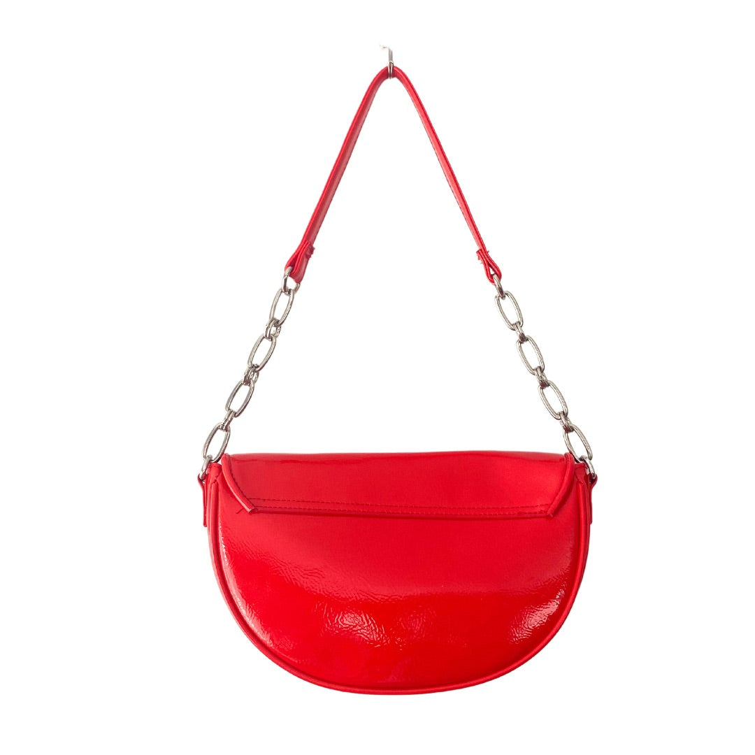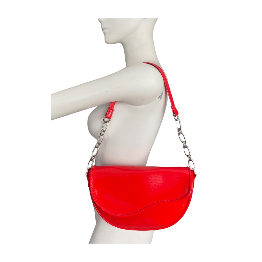 This striking red handbag redefines modern elegance with its sleek, curved silhouette and eye-catching chain strap. The bold red hue makes it a standout accessory, perfect for adding a pop of color to any ensemble. Crafted with a glossy finish, the bag offers a contemporary look, while its design ensures it’s both practical and chic. Whether you’re heading to a brunch or an evening out, this bag is the perfect companion for the fashion-forward individual.