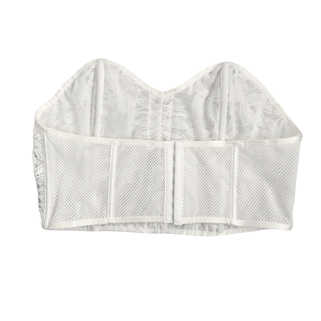 This structured white lace bustier is your ultimate go-to for a bold yet feminine statement. The intricate floral lace overlay, combined with a corset-style front, nods to a modern take on vintage lingerie. With supportive boning that accentuates the figure and a mesh back for added comfort and breathability, this piece is perfect for pairing under a blazer or wearing solo with high-waisted trousers.