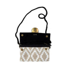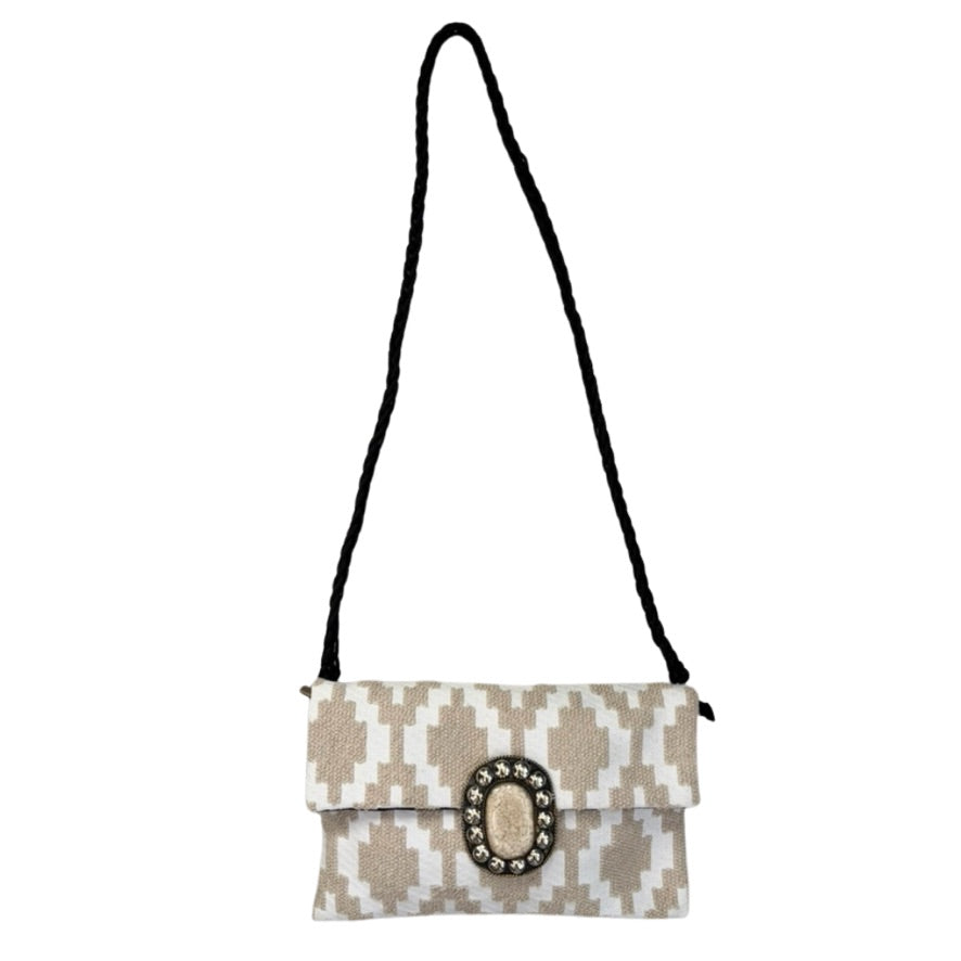 Soft neutral tones and a geometric weave give this crossbody quiet character without shouting for attention. The gem-style medallion acts like jewellery against the ikat-inspired pattern. Wear it crossbody with relaxed denim by day or remove the strap and carry it as a clutch for low-key evening plans.