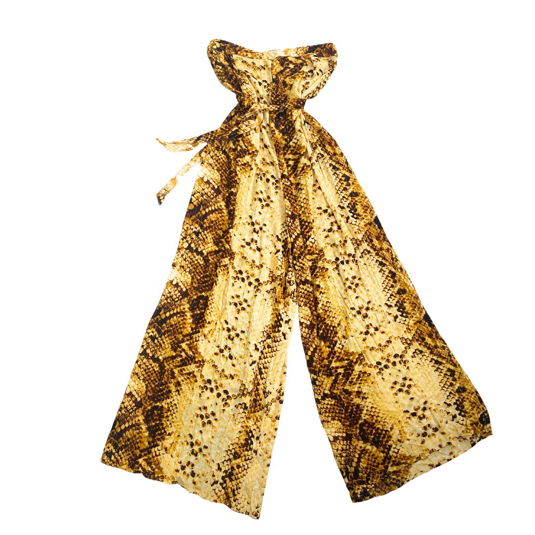 This bold strapless jumpsuit makes a striking statement in a snakeskin print, ideal for those who want to stand out. Its flowy wide legs offer movement and ease, while the smocked back ensures a flattering, comfortable fit. Perfect for warm-weather outings, its vibrant yellow tones are sure to catch the eye. Pair with neutral accessories to allow the print to shine, or go all out with bold accents for a look that turns heads at every step.
