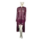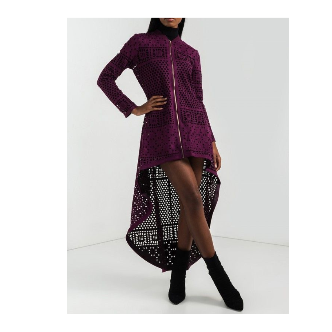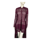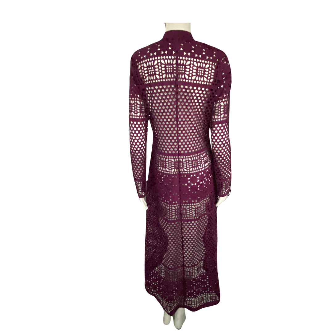 This deep plum duster cardigan is a celebration of intricate laser-cut. With an eye-catching mesh design that creates geometric patterns, this longline piece offers just the right mix of drama and boho vibes. The high-low hemline adds fluidity, while the rich purple hue brings warmth to your autumn layering game. Whether thrown over a minimal slip dress or paired with slim-fit jeans and boots, this statement knit effortlessly takes your look from day to night with a touch of laid-back chic.