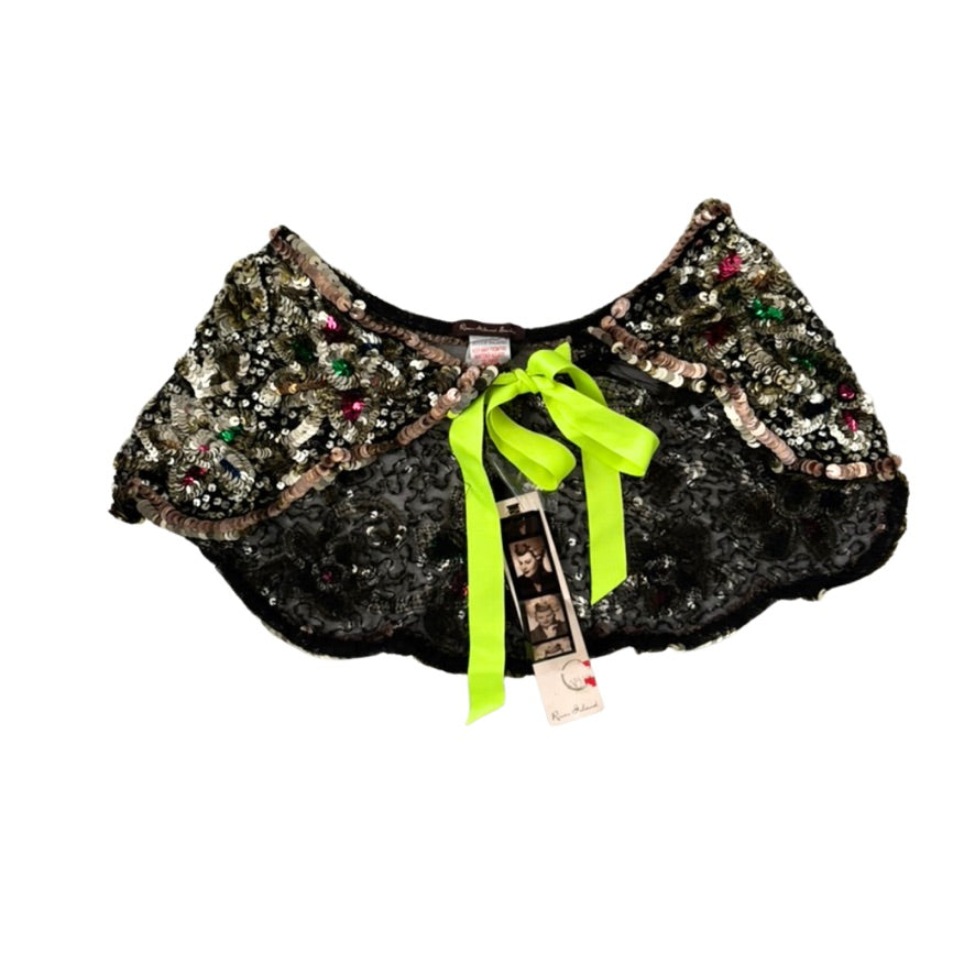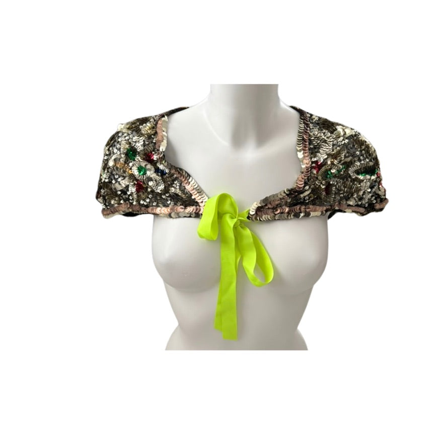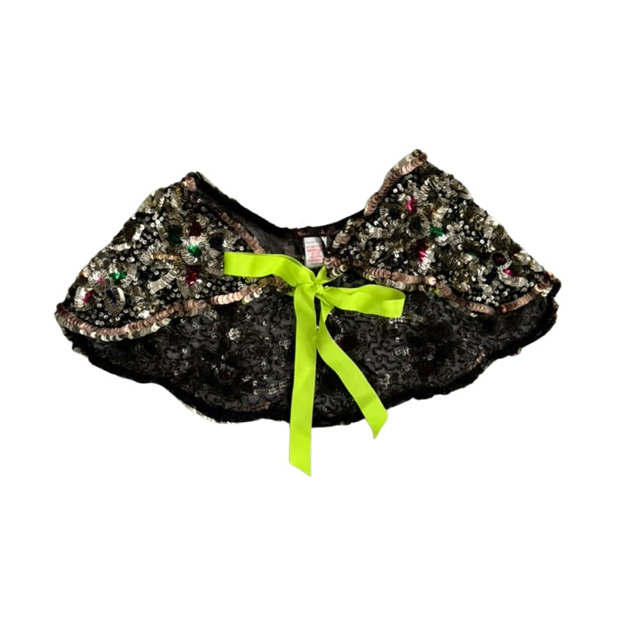 A high-shine finishing touch for party looks: this sequin-strewn capelet skims the shoulders and ties at the front with a satin ribbon in a zingy chartreuse. The black mesh base keeps it light; the embroidery and faceted beads catch the light for a jewel-box shimmer. Style over slip dresses, camis, or tailored shirting for instant drama without the effort.