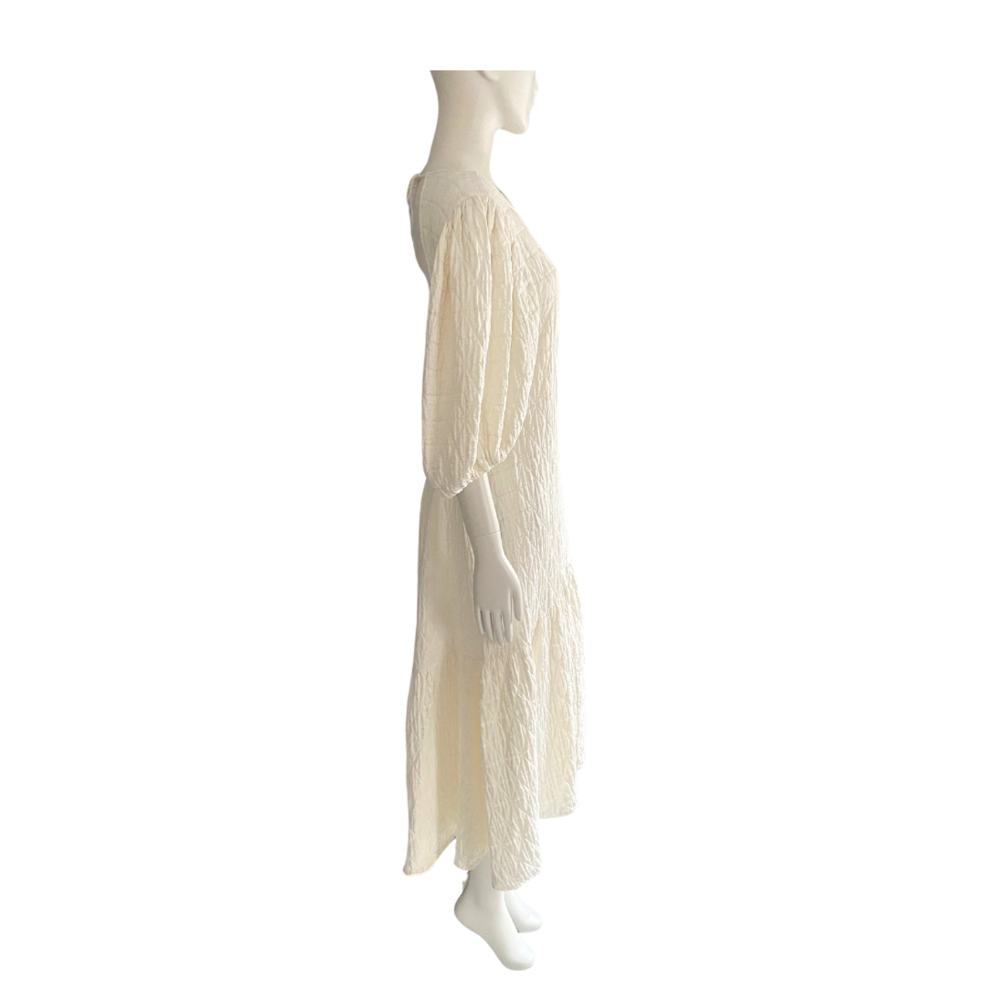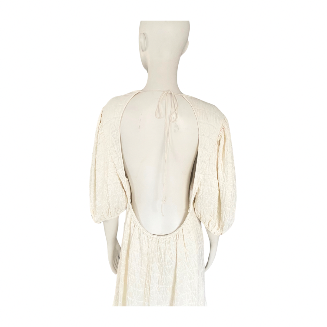 Step into the realm of timeless beauty with this voluminous midi dress, crafted to elevate your everyday wardrobe. The soft quilted texture brings a playful yet structured feel, while the delicate puff sleeves add a touch of understated drama. But the real surprise lies in the open-back detailing—an unexpected glimpse of skin that feels as striking as it does effortless. Ideal for a sun-soaked brunch or layered for a winter gathering, this dress is an ode to modern femininity with a whisper of edge.