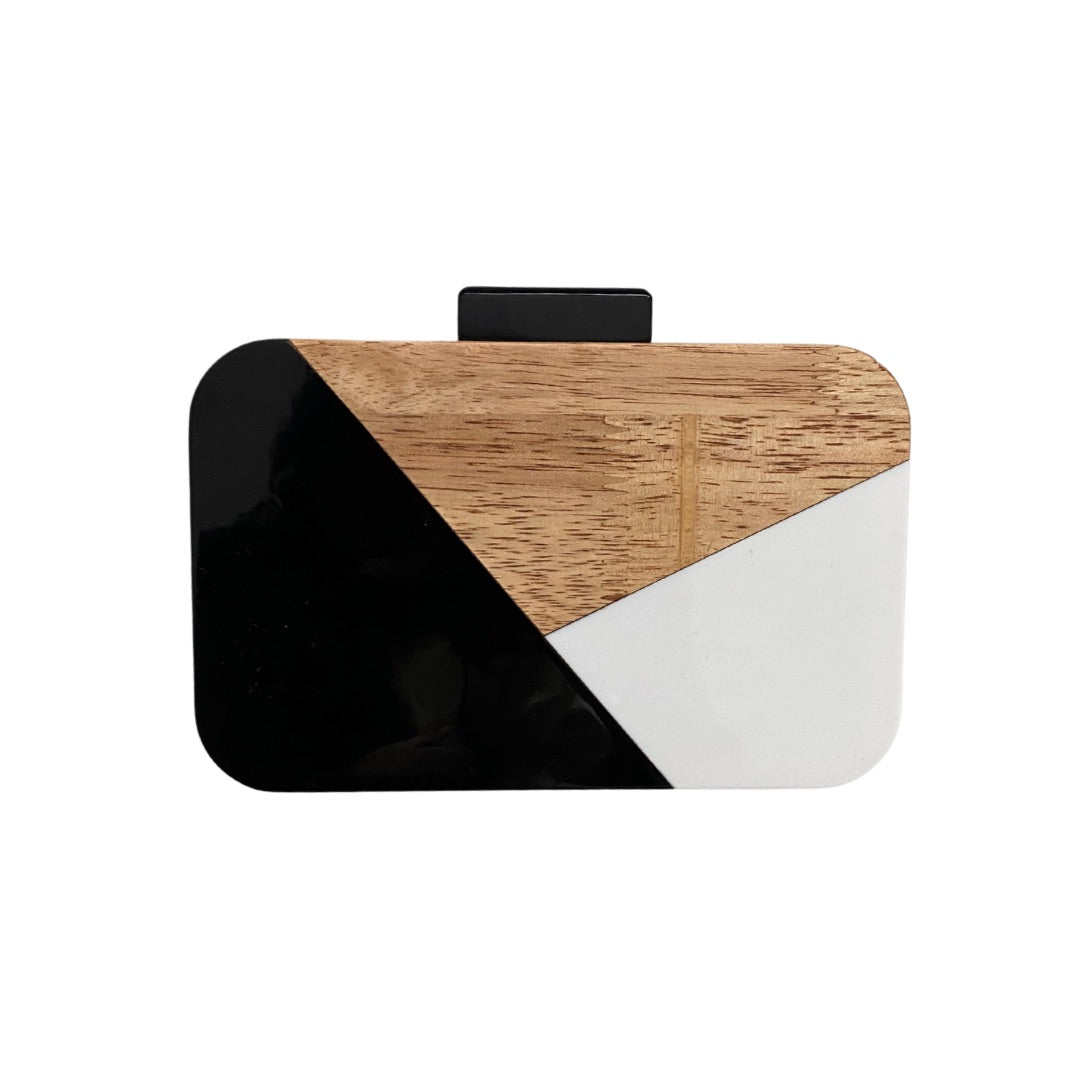 Stand out with this Mini Box Clutch Crossbody Bag. Featuring a bold Geometric Pattern, this bag is a chic addition to any outfit. The distinct Colour Block design in Black, White, and Brown adds a pop of color. Use as a clutch or wear it as a Crossbody with the Detachable Long Chain Strap. Snap Closure for convenience.