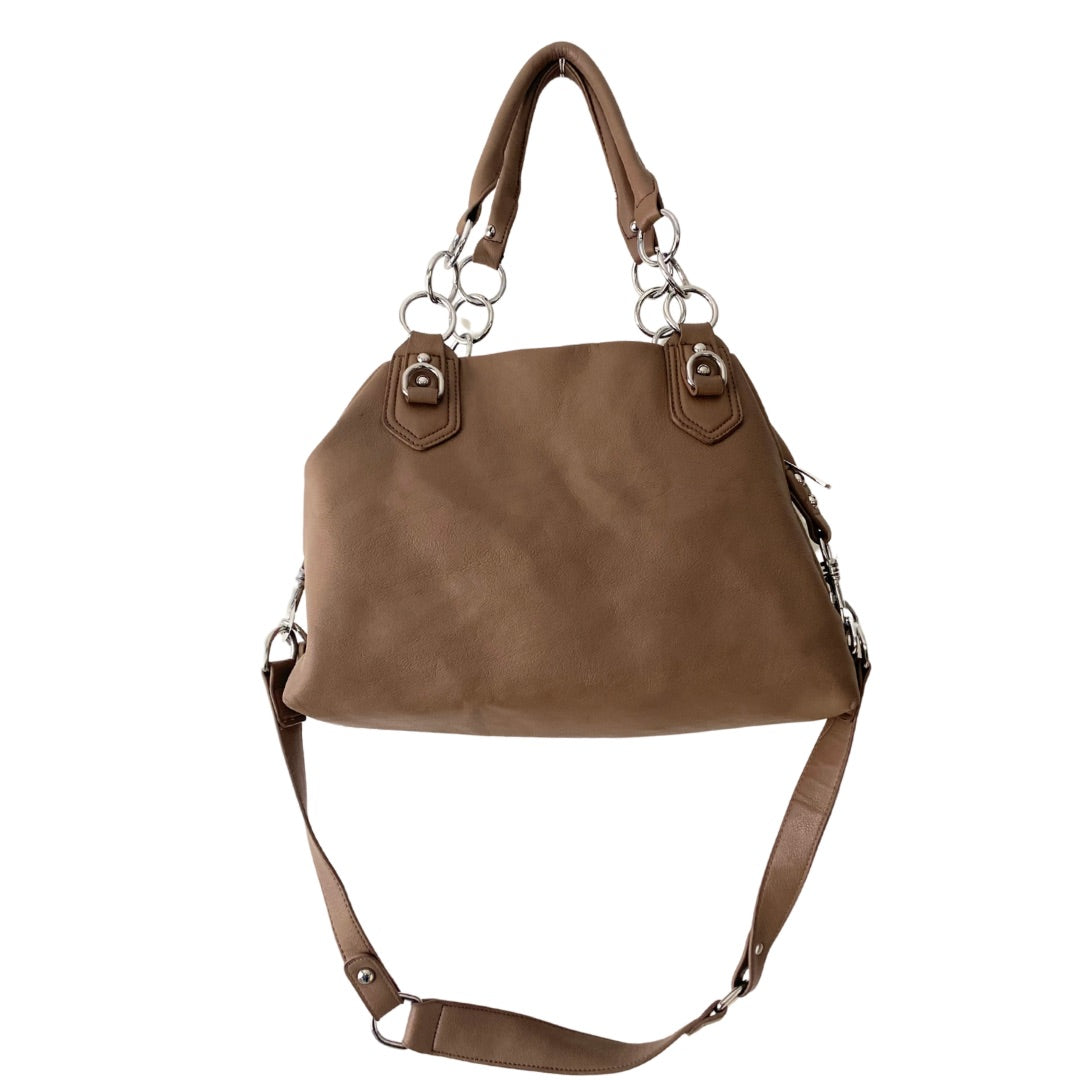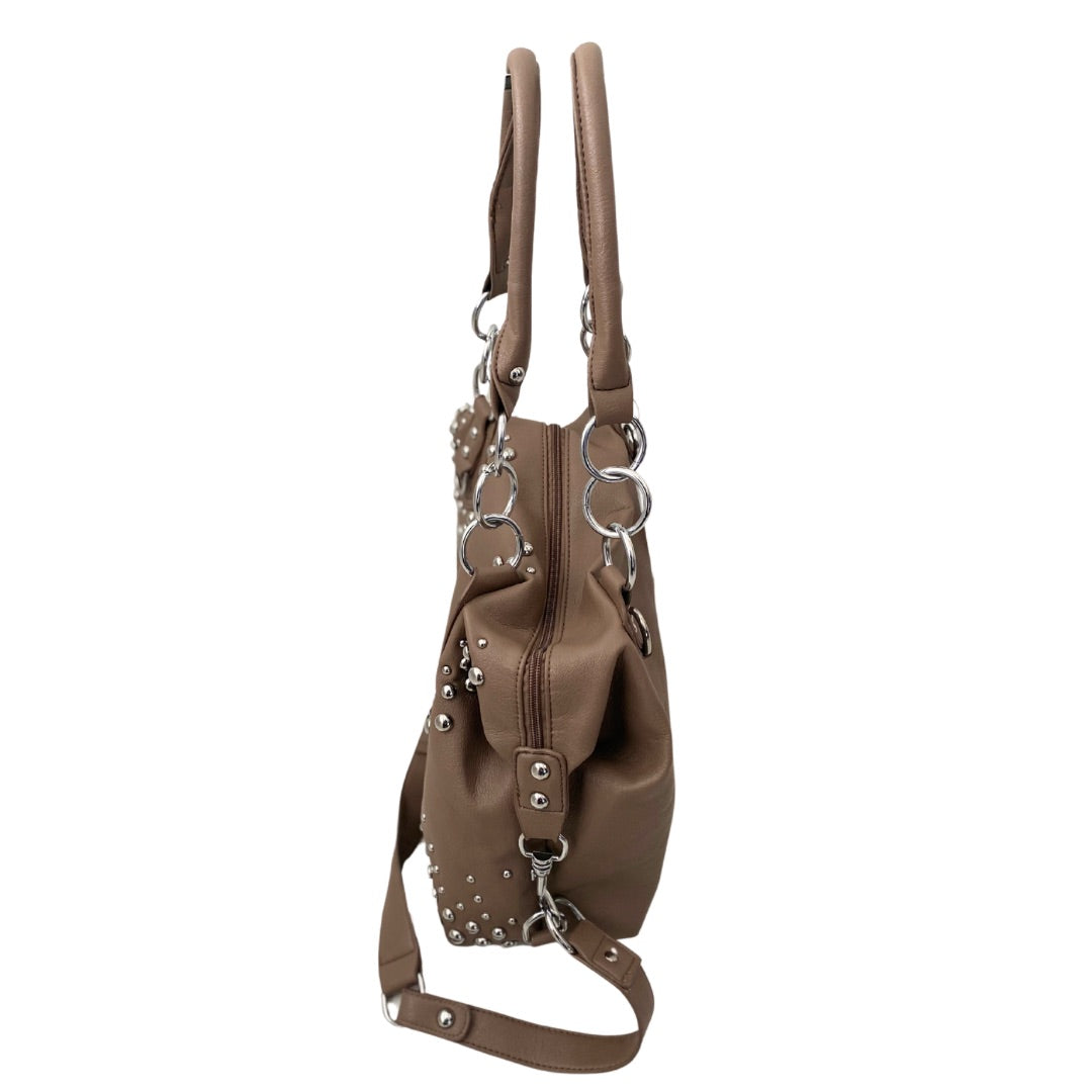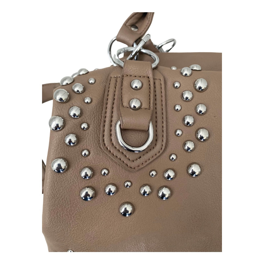 Bring some attitude to your everyday style with this taupe shoulder bag, armed with metallic studs for that perfect balance of utility and edge. Double top handles with chunky chain accents and an adjustable shoulder strap offer versatility, making it perfect for both work and play.