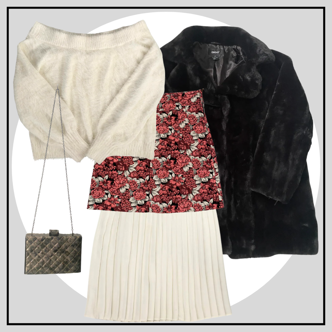 Winter florals skew quietly decadent here. A fuzzy off-white knit is slouched over a rose-printed mini, with an ivory pleated skirt peeking out beneath for that layered, skirt-over-skirt silhouette fashion editors love. The inky faux fur coat turns up the volume, pulled on like a borrowed heirloom for late nights and last trains home. A metallic quilted box bag finishes the look with subtle shine – romantic, slightly offbeat, and made for festive cold-weather plans.