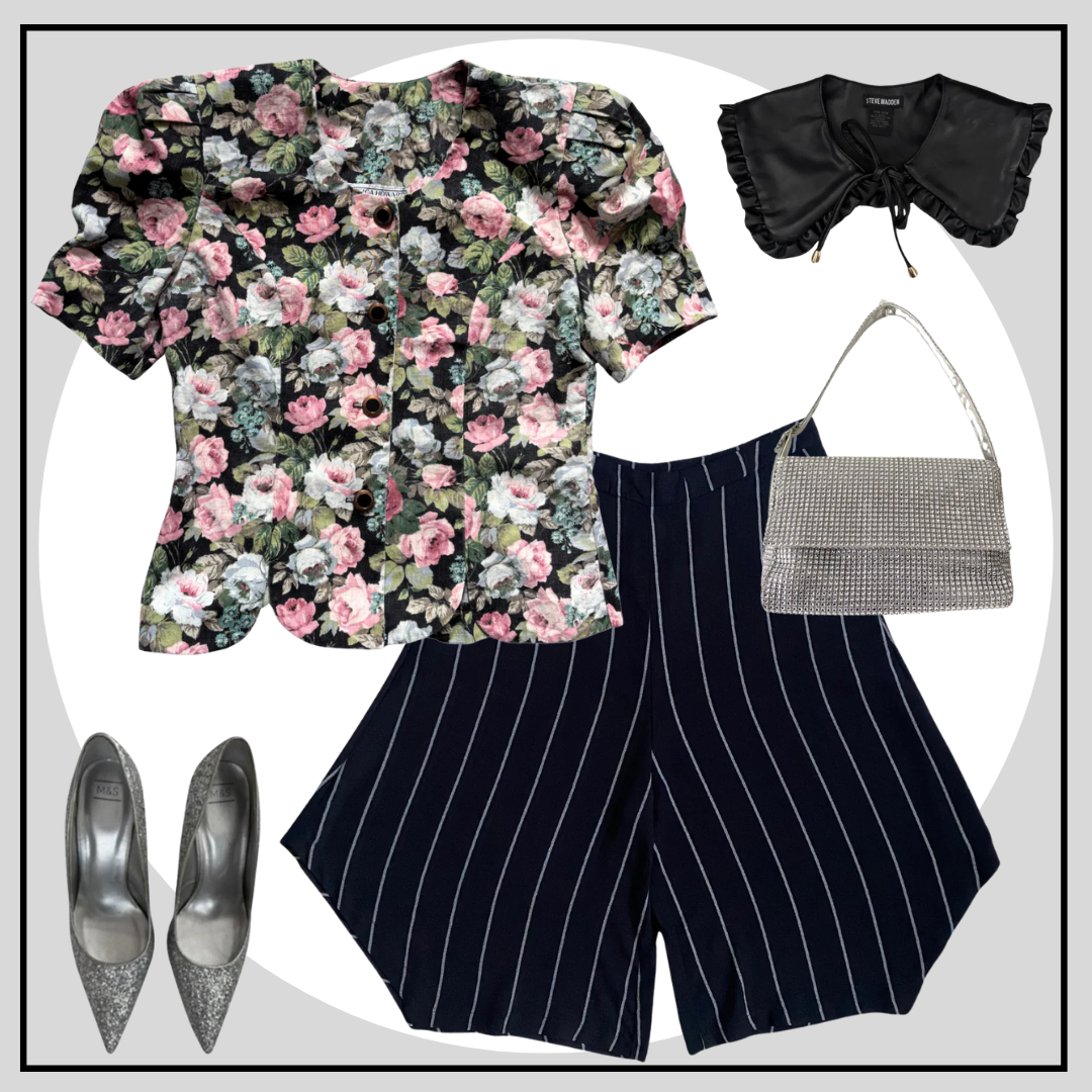 Florals go power-play here. A vintage, puff-shoulder blouse in painterly blooms is teamed with wide pinstripe culottes, ticking the print-clash trend while keeping the silhouette sharp. Slip the faux-leather collar over the neckline to give the look depth. Glitter-flecked stilettos and a diamanté -studded shoulder bag bring evening energy without losing the slightly offbeat mood. Wear it to parties where the dress code is somewhere between “creative office” and “late-night dance floor.”