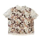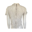 This delicate lace top is a masterclass in intricate craftsmanship and modern femininity. The front is adorned with a mesmerising mix of embroidered patterns in earthy tones, creating a textured, almost sculptural effect against the sheer lace backdrop. The short sleeves and high neckline balance the intricate detailing with a touch of modesty, while the exposed zip at the back adds a hint of contemporary edge. Pair it with high-waisted trousers or a sleek skirt to create a look that’s both timeless and effortlessly cool.