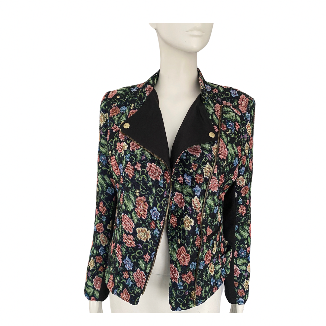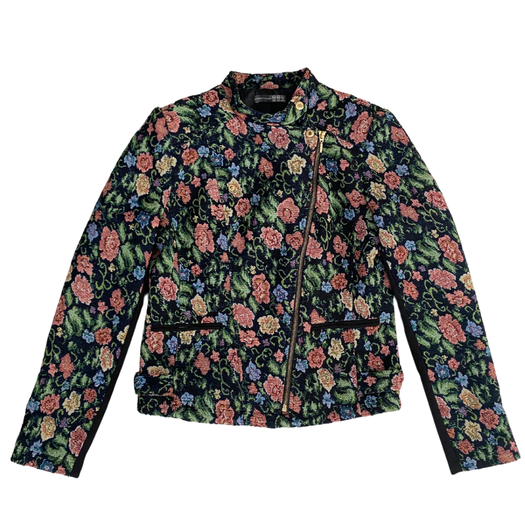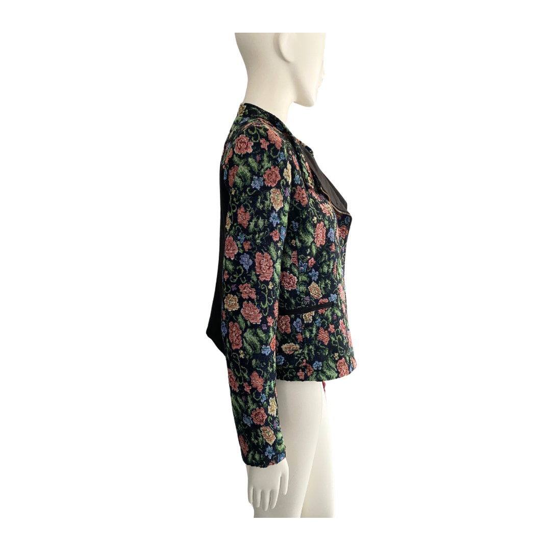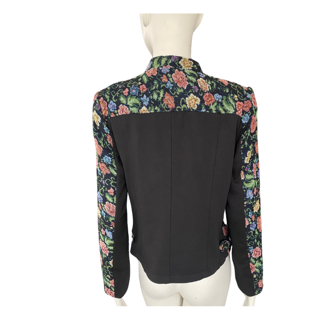 Unleash your creative side with this stunning tapestry-style jacket. Embroidered floral motifs bloom against a black background, adding a touch of artistic elegance to any look. The asymmetric zip closure and structured silhouette balance femininity with a modern edge, while the soft black paneling on the sleeves offers a sleek contrast to the vibrant, textural design. Pair it with denim for a daytime twist or with black pants for a striking evening vibe.