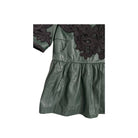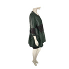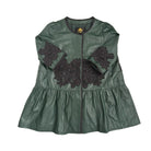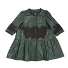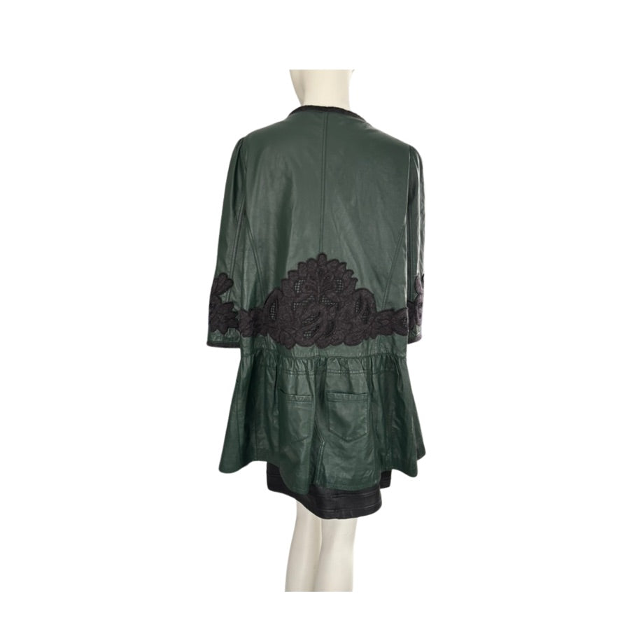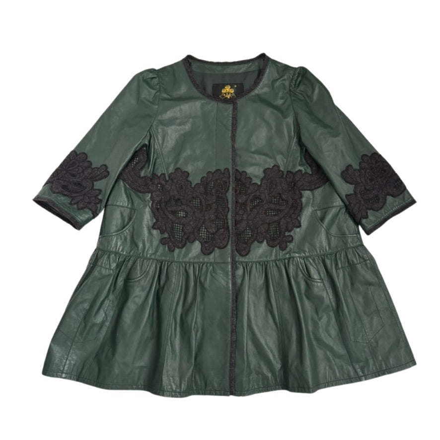A statement coat with a soft swing silhouette and couture-style lace appliqué banding. Cut in deep forest green leather with subtle volume through the body, it skims and flares for an easy, throw-on shape. Three-quarter sleeves show bracelets, while the edge-to-edge front layers neatly over knits or a slip dress. Consider it your drama piece for cold-weather dinners and weekend shenanigans.