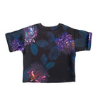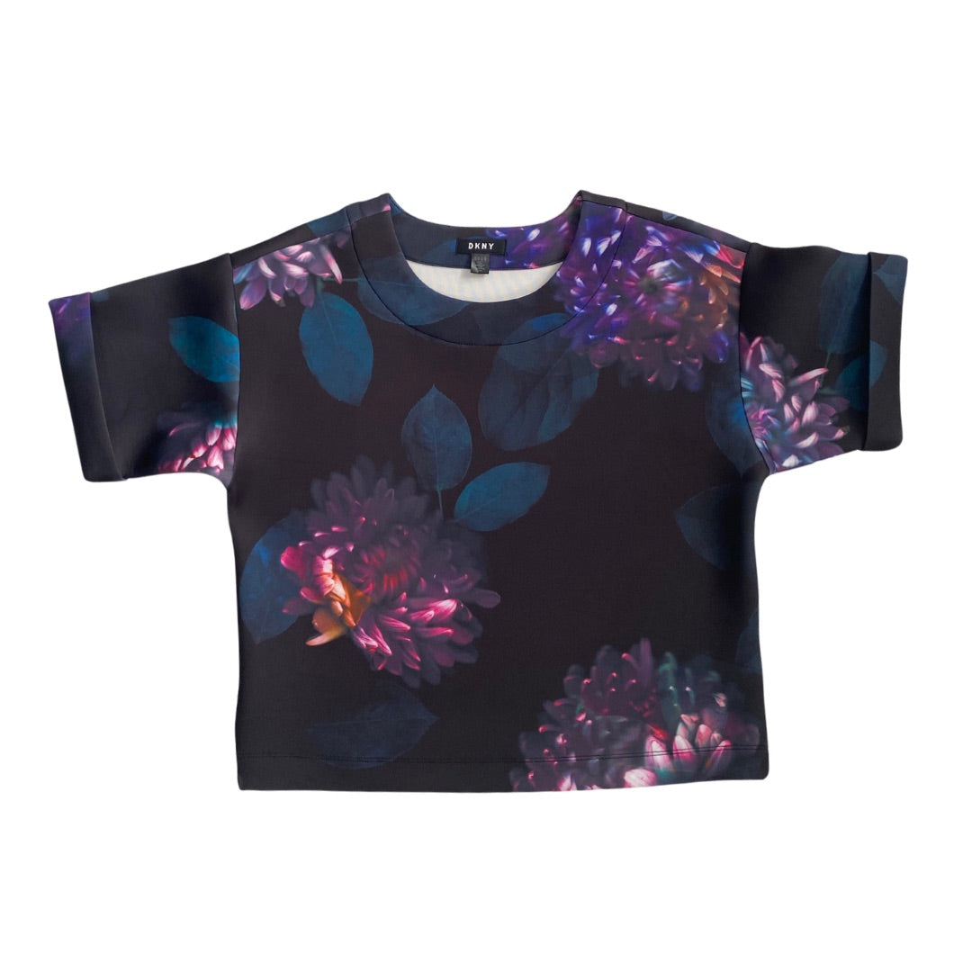 Embrace casual chic with this striking DKNY top, featuring a captivating dark floral print. The rich hues of purple, pink, and blue against a black background create a sophisticated yet edgy look. The relaxed fit and short sleeves make it perfect for effortless everyday wear, while the high-quality fabric ensures comfort and durability. Pair this top with your favorite jeans or a sleek skirt for a versatile outfit that transitions seamlessly from day to night.