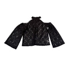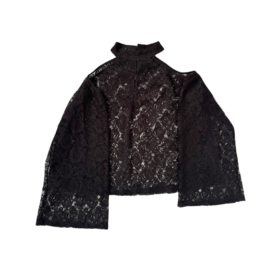 A sheer lace halter that plays with negative space and soft structure. The ruffled mock neck and front keyhole add definition, while the cutaway shoulders flow into long, airy sleeves. Wear it over a sleek cami or bralette for texture and contrast; it’s a light, layer-friendly piece that shifts easily from desk to dinner without feeling precious.