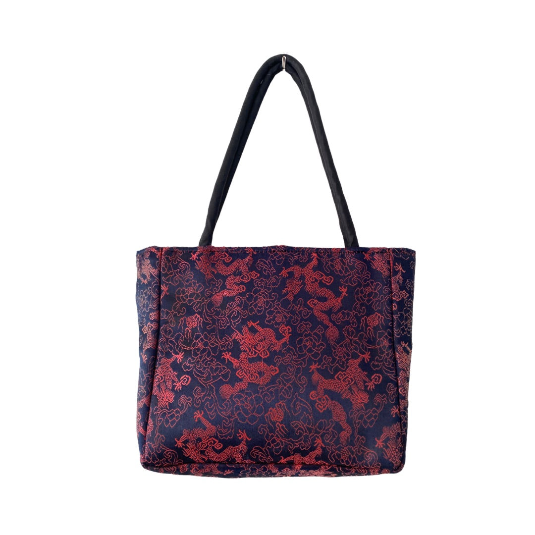 Unleash your inner dragon with this luxurious Silk Vintage Mini Tote Bag in Navy. Adorned with an elegant embroidered dragon pattern in contrasting red and gold, this bag also features double top handles, a large knot feature, and a single top loop fastening. Add interest to any outfit with this unique accessory.