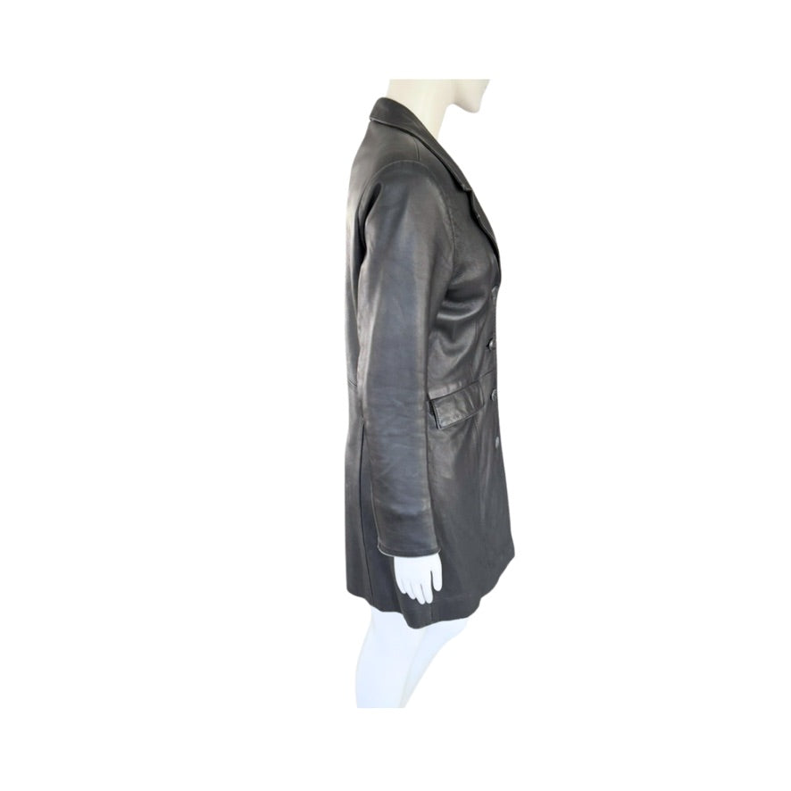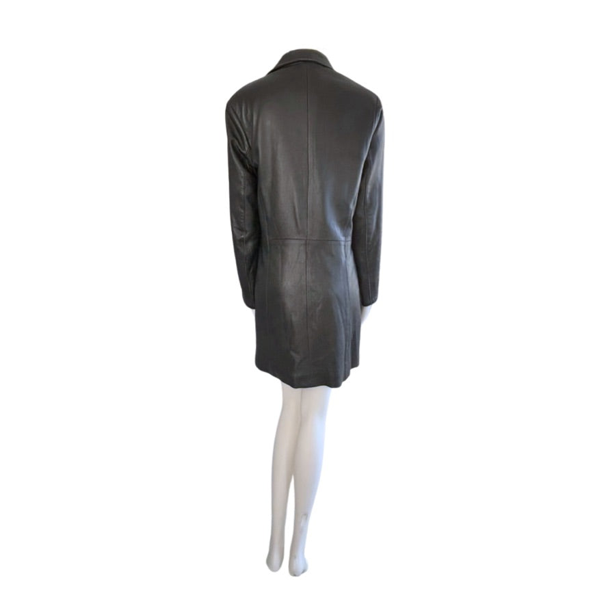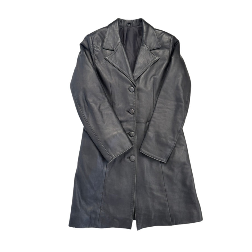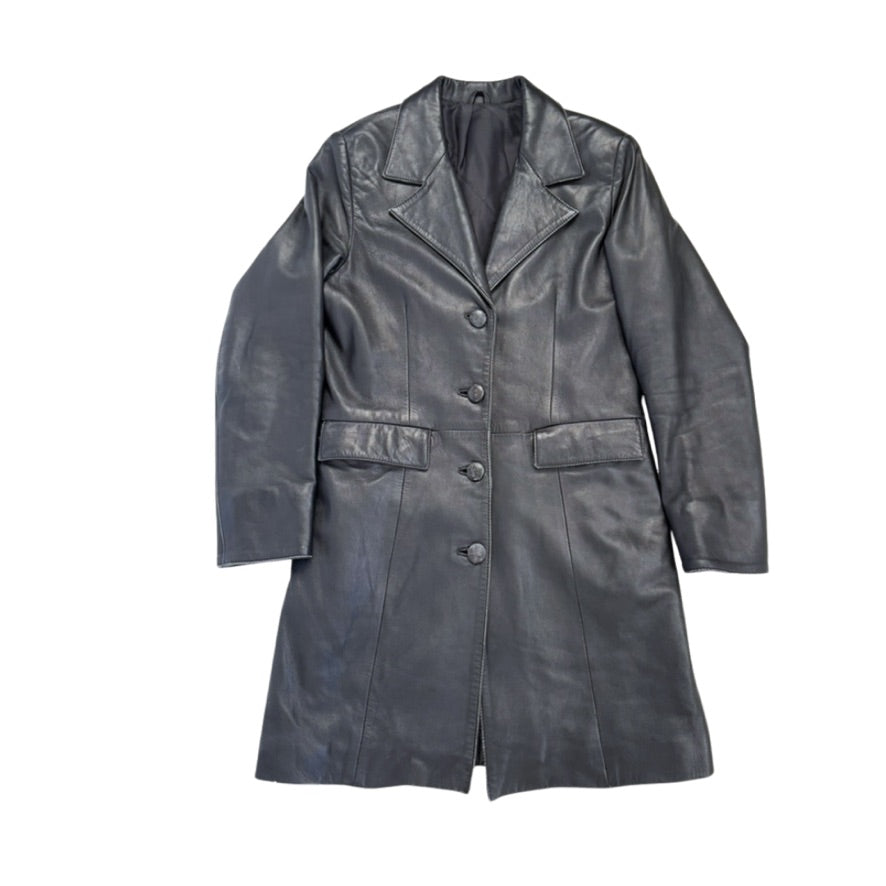 A sharp, 90s-leaning leather blazer coat with a longline cut and neat notch lapels. Soft drape through the body makes it easy to layer over knits or a slip dress. Front flap pockets and a four-button closure keep it clean and minimal.