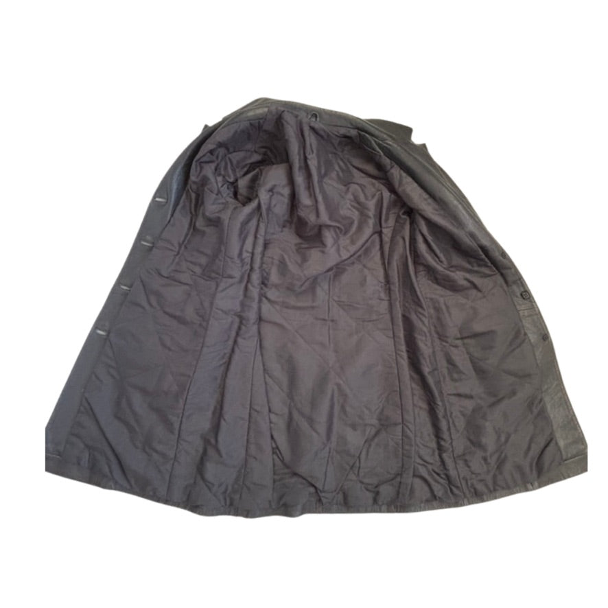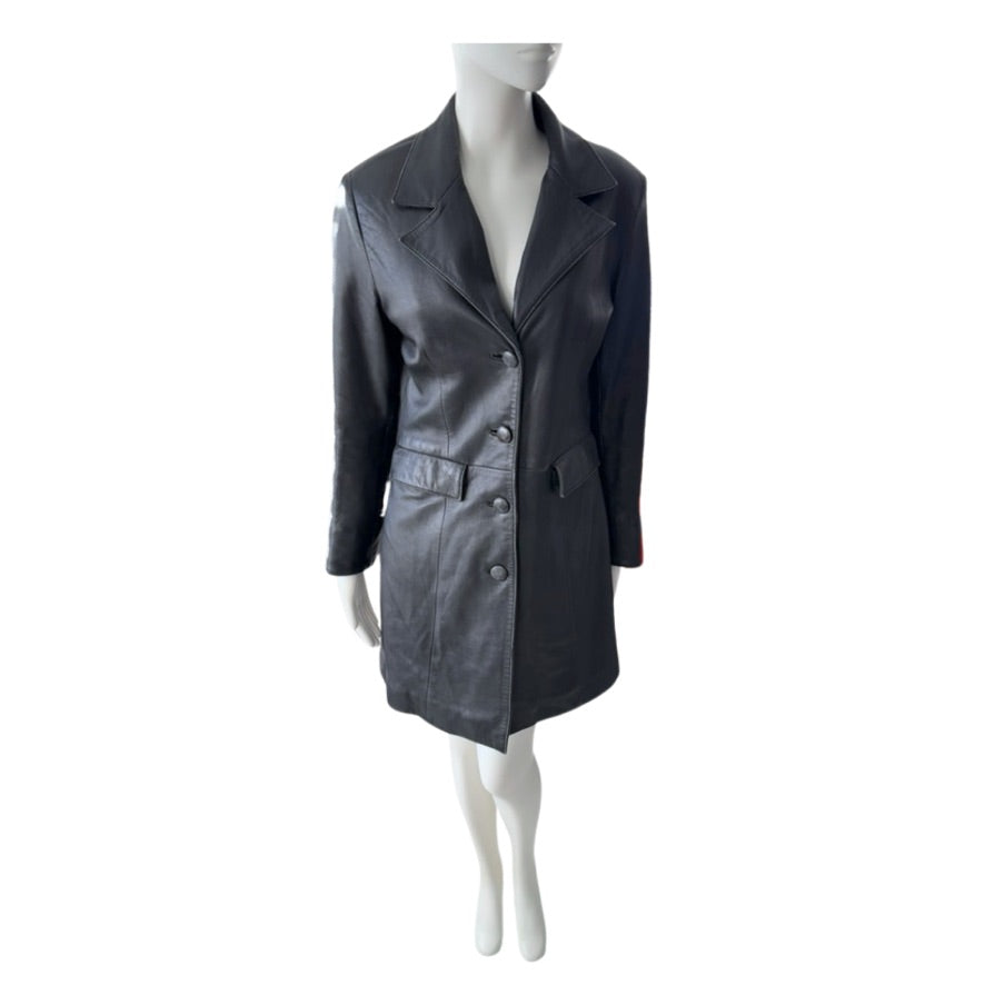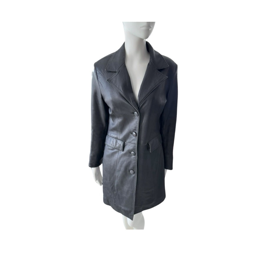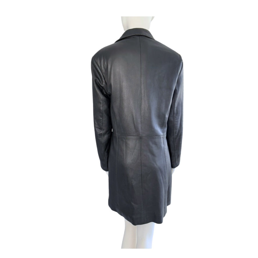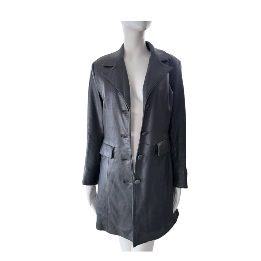A sharp, 90s-leaning leather blazer coat with a longline cut and neat notch lapels. Soft drape through the body makes it easy to layer over knits or a slip dress. Front flap pockets and a four-button closure keep it clean and minimal.