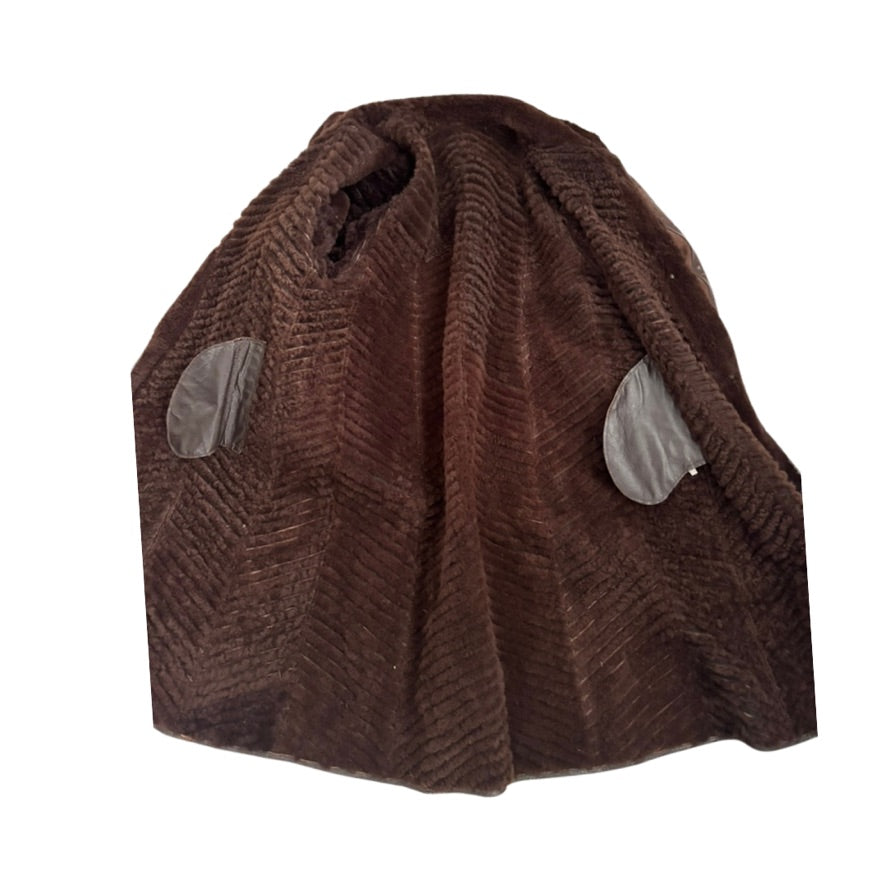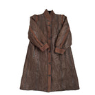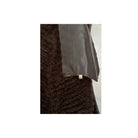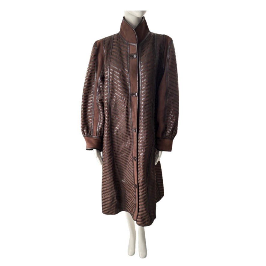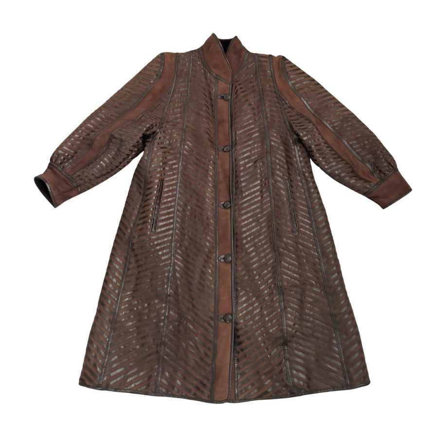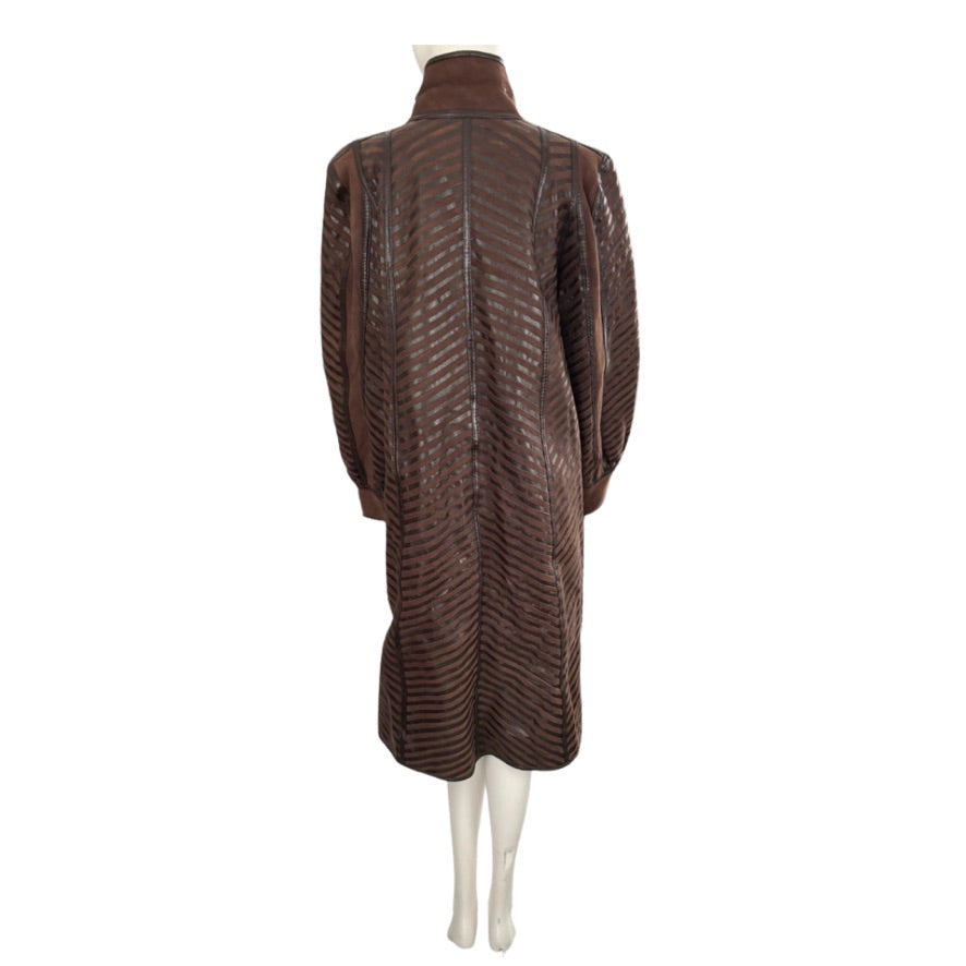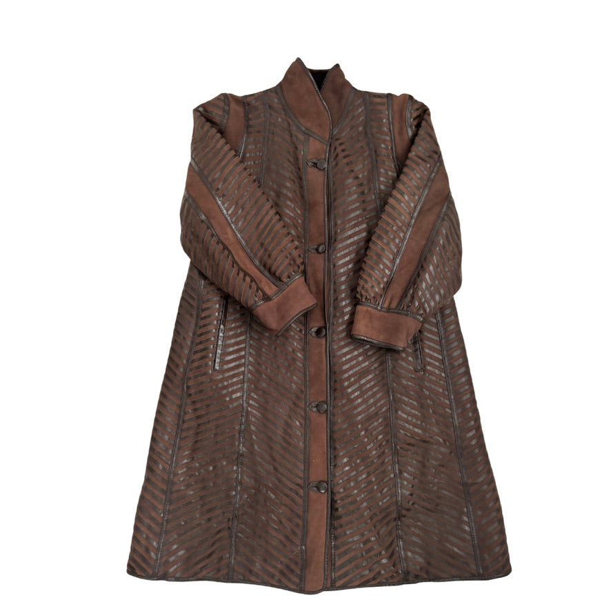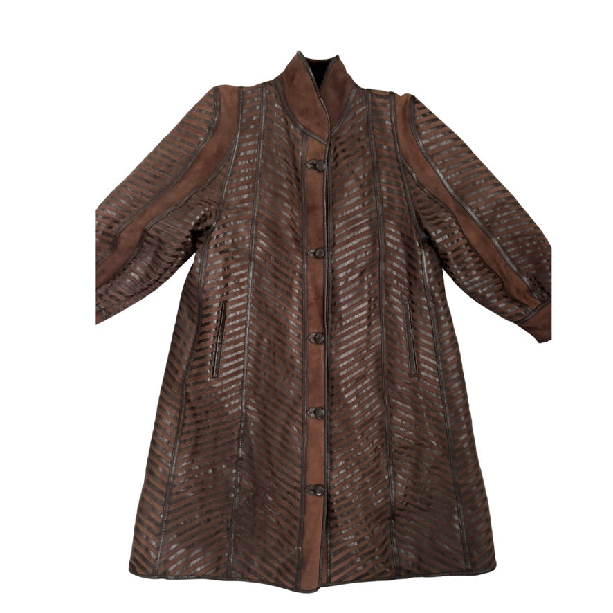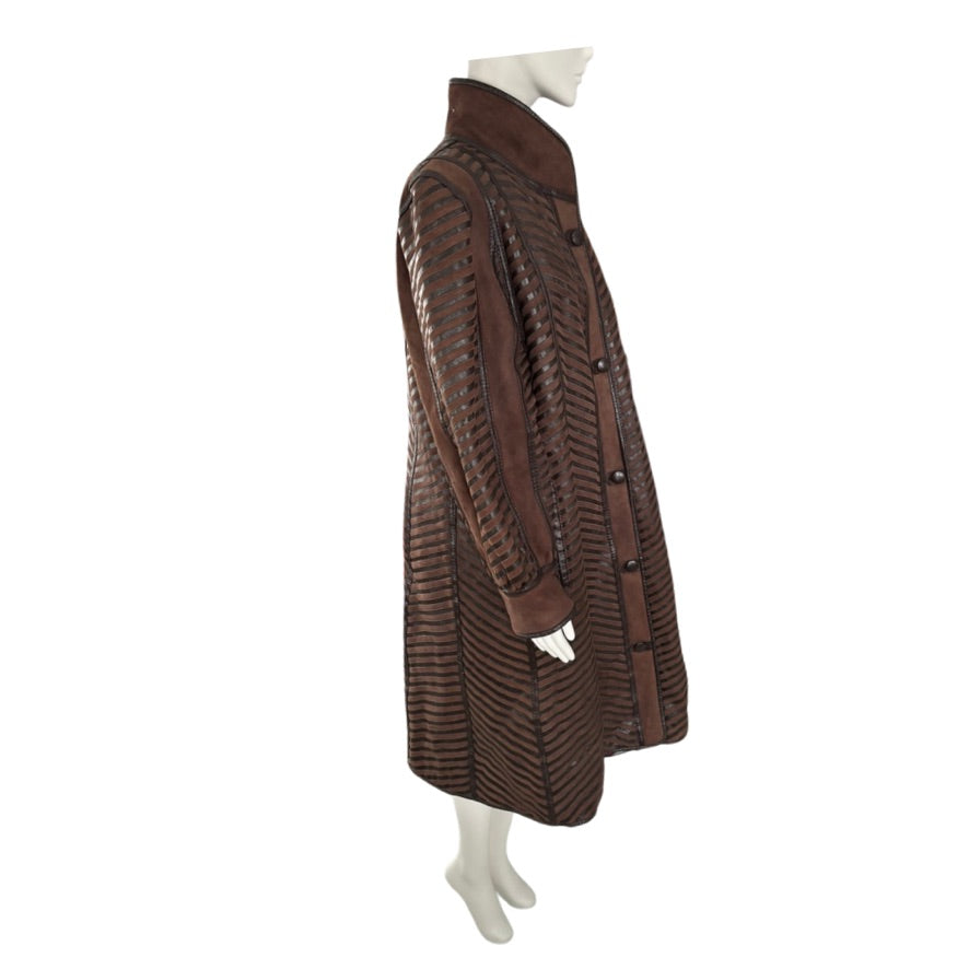 Chevron-Cut Leather Longline Sheepskin Coat Brown Size UK 18 – Vintage