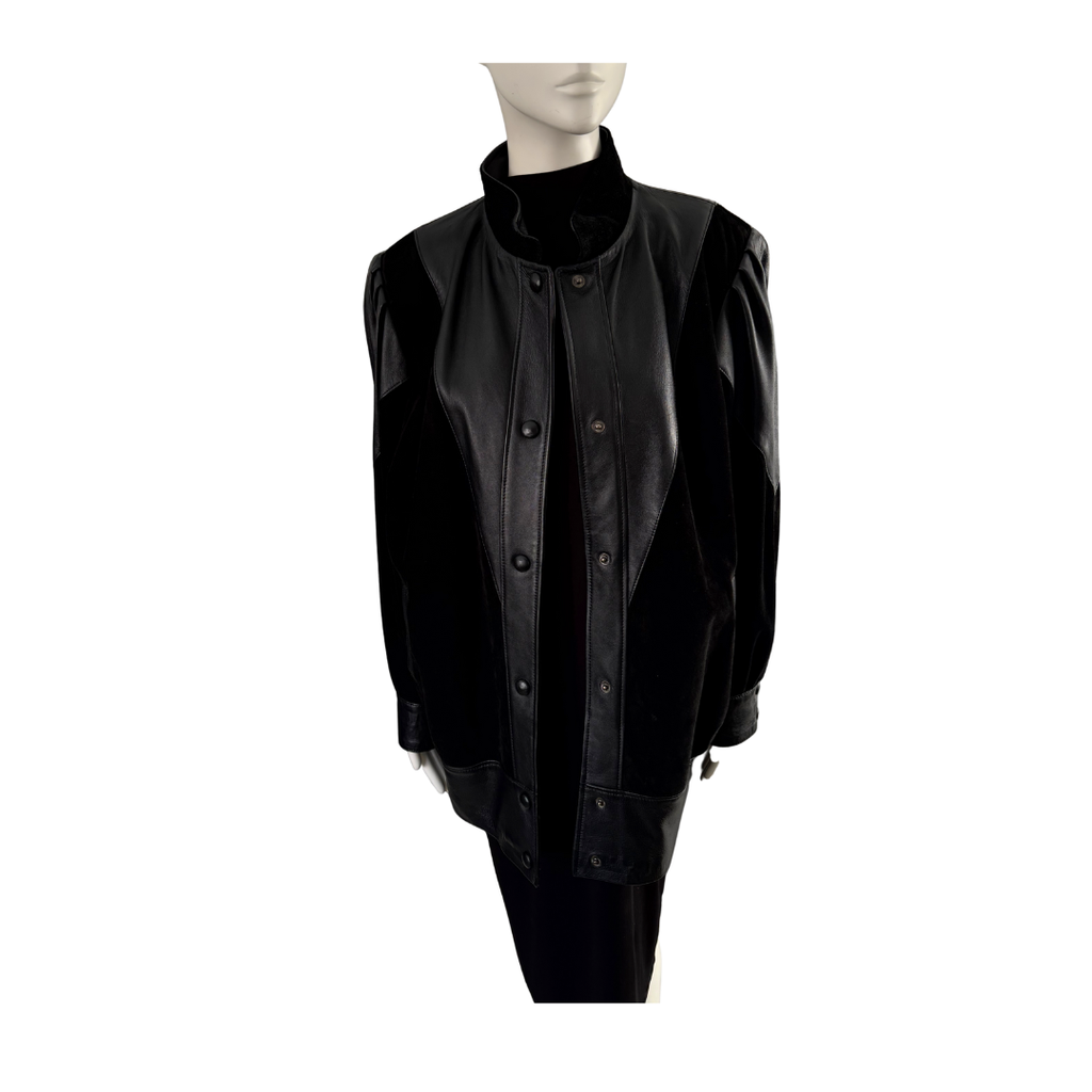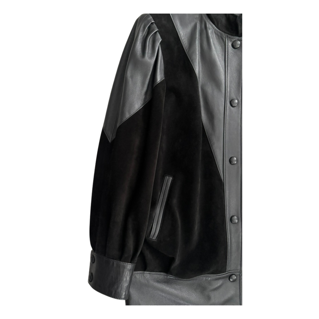 Part bomber, part art piece — this vintage black jacket plays with texture and proportion in the most striking way. A mix of soft suede and smooth leather panels create a sculptural, almost architectural silhouette, complete with puffed shoulders and a stand collar for a clean, confident line.