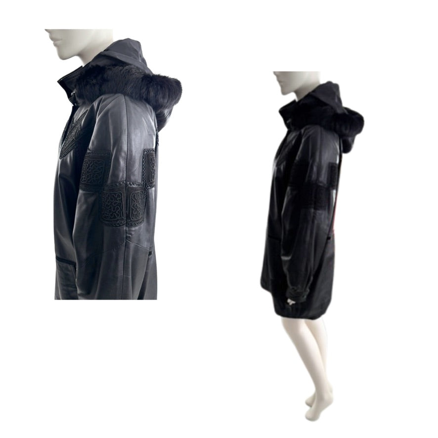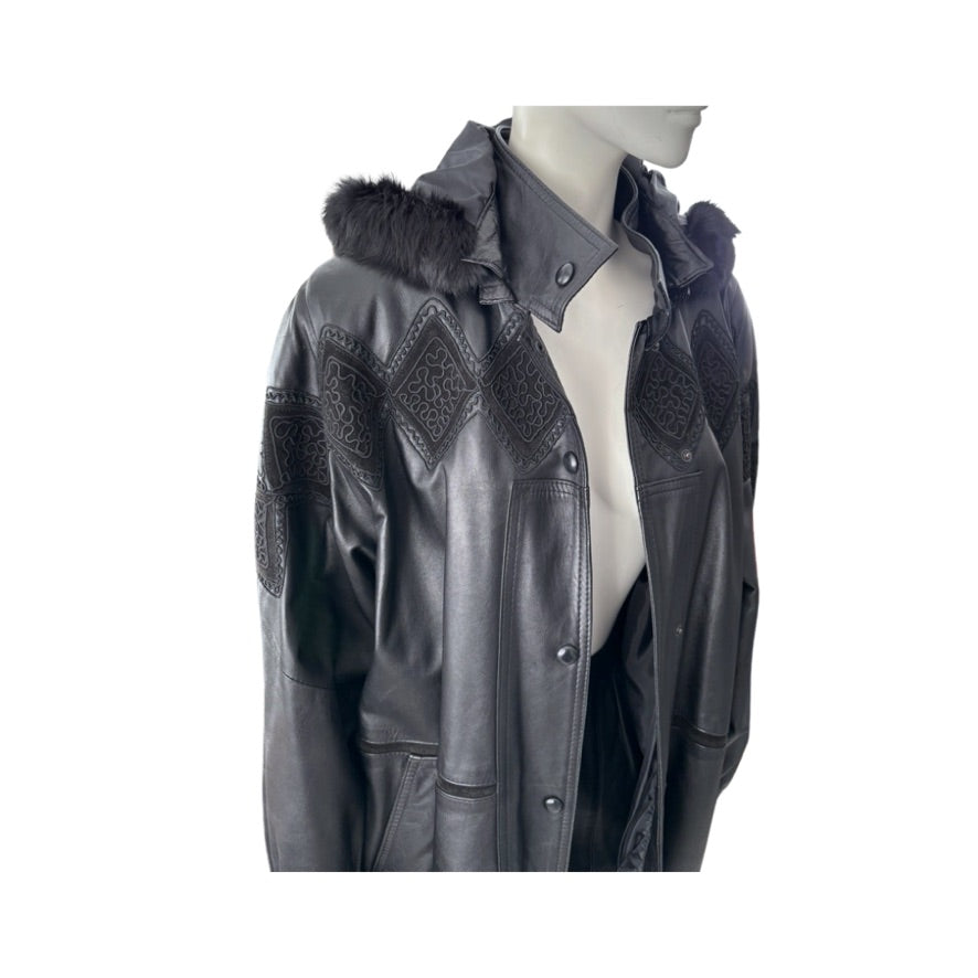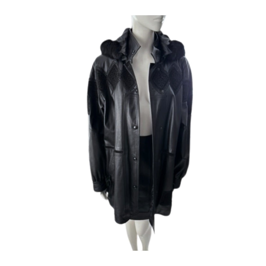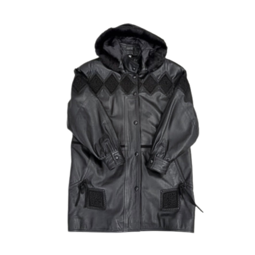 Diamond Appliqué Leather Hooded Parka Black Size 16 - Vintage