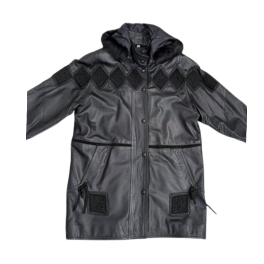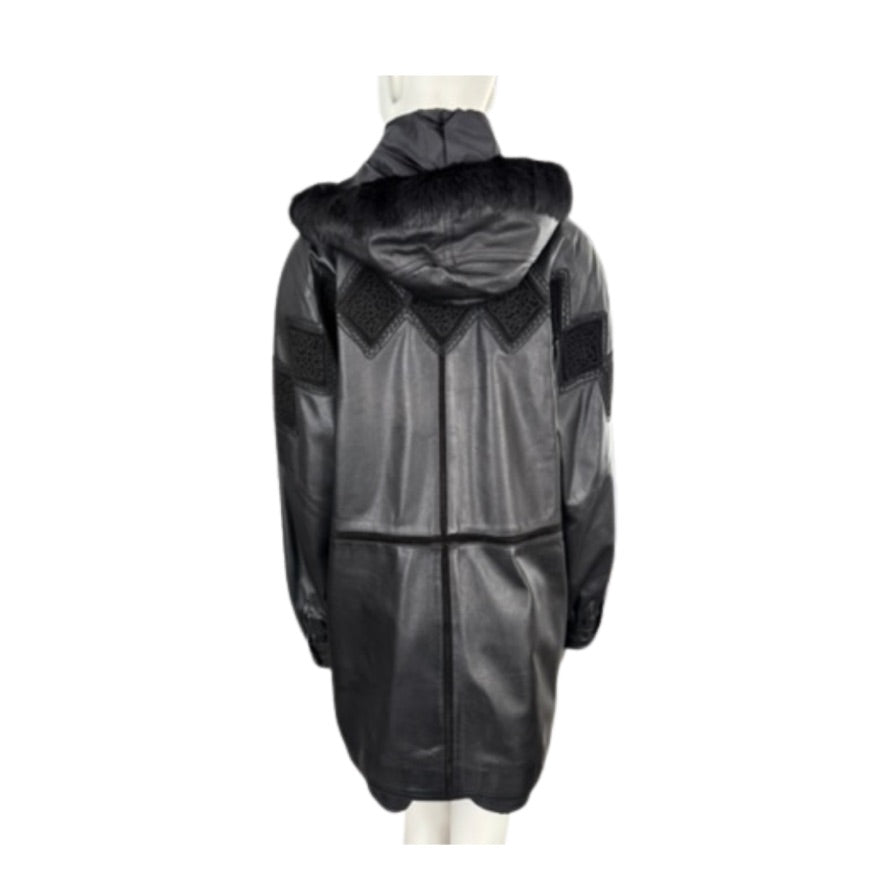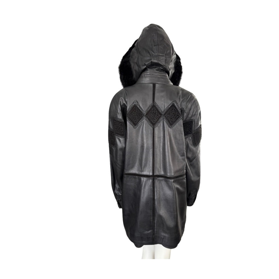A statement leather parka with plush-trim hood and tonal appliqué detailing across the yoke and sleeves. The longer, easy silhouette layers cleanly over knits; snap buttons and roomy pockets keep it practical. Style with straight-leg denim and boots or throw over a slip dress for high/low contrast—this is winter armour with attitude.