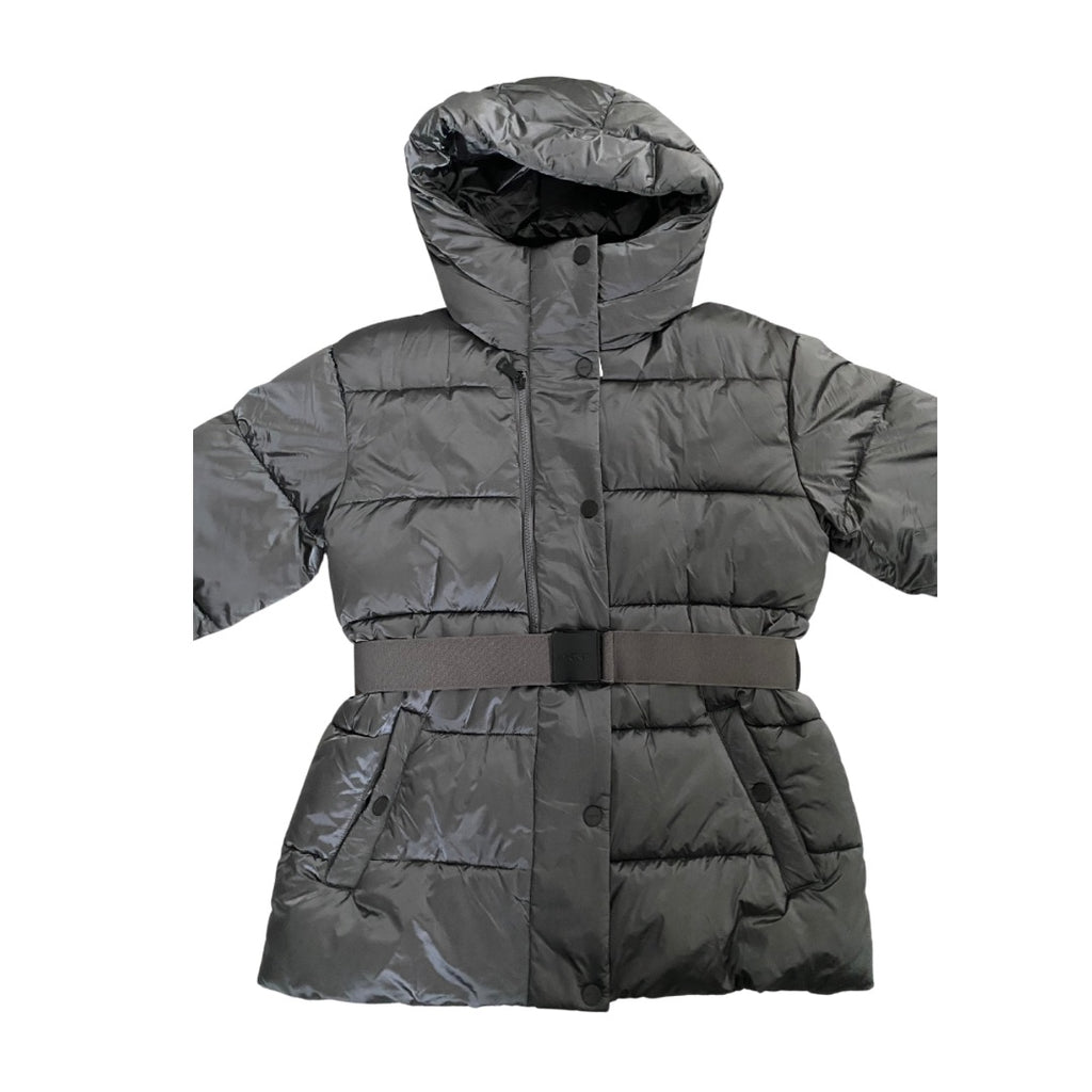 Effortlessly functional with a city-sleek edge, this DKNY puffer coat in grey metallic delivers all-weather confidence with a fashion twist. Designed with a high-shine nylon shell, padded warmth, and hood, it’s finished with a wide elastic belt that defines the silhouette without compromising comfort. Ideal for cold commutes, weekend walks, or layering over winter knits. Practical yet elevated, it’s classic DKNY: New York attitude meets everyday versatility.
