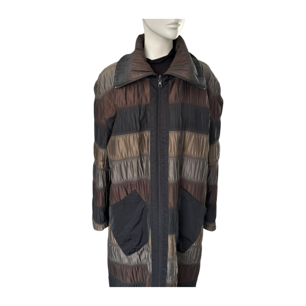 A statement in subtle texture and tonal layering, this spectacular coat blends structure and softness in equal measure. The horizontal ruched panels in shades of mocha, olive, taupe, and charcoal create a sculptural, almost architectural rhythm — a wearable landscape of earthy hues. Designed with an exaggerated length for drama and warmth, it features a high funnel neck, oversized patch pockets, and toggled drawcords for adjustable volume. Lightweight yet insulating, this piece channels that effortless European winter aesthetic — utilitarian at heart, quietly luxurious in execution.